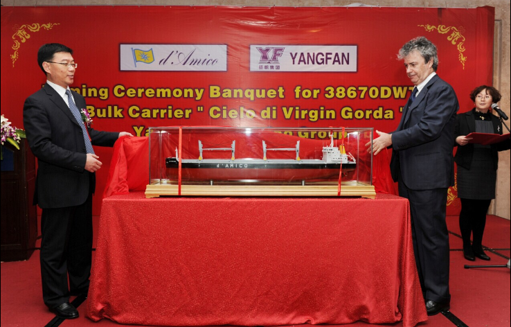 圖為:d‘Amico 集團首席執行官Cesare d'Amico 和揚帆集團董事長、總裁李明東在命名午宴上為船模揭幕。