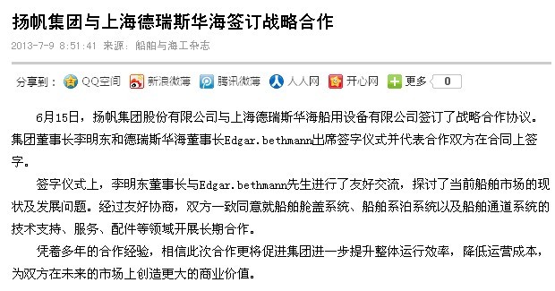 船舶與海工:揚帆集團與上海德瑞斯華海簽訂戰(zhàn)
